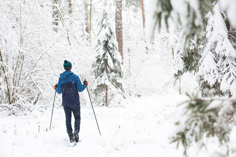 Лыжник в ветровке и шляпе с помпоном с лыжными палками в руках спиной на фоне заснеженного леса. Беговые лыжи в зимнем лесу, спорт на открытом воздухе, здоровый образ жизни