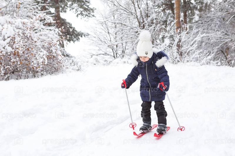 Детские ножки в красных пластиковых лыжах с палками идут по снегу с горки-зимний вид спорта, семейное развлечение на свежем воздухе. Маленькая девочка скользит по склону с раннего возраста. Копировать пространство