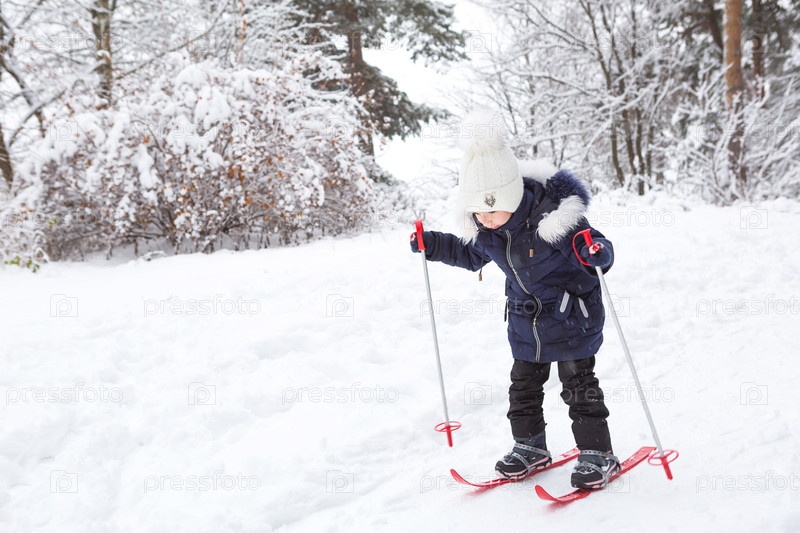 Детские ножки в красных пластиковых лыжах с палками идут по снегу с горки-зимний вид спорта, семейное развлечение на свежем воздухе. Маленькая девочка скользит по склону с раннего возраста. Копировать пространство