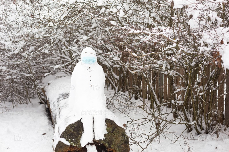 Снеговик в медицинской маске - новая реальность, защита от болезней, инфекций, жизнь в условиях эпидемии ковида. Женские руки надевают маску снеговика. Зимний семейный отдых на свежем воздухе