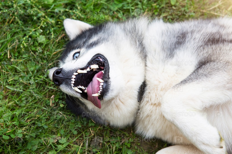 Собака хаски довольно лежит на траве с высунутым языком, открытым ртом и улыбается. Счастливый и довольный питомец, здоровье животных, ветеринария. Дрессировка собак, игры с хозяином