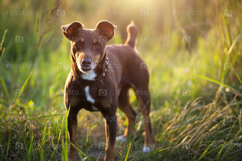 Маленький коричневый терьер гуляет с ошейником по траве и под летним солнечным светом. Собака в природе, портрет Джека Рассела терьера
