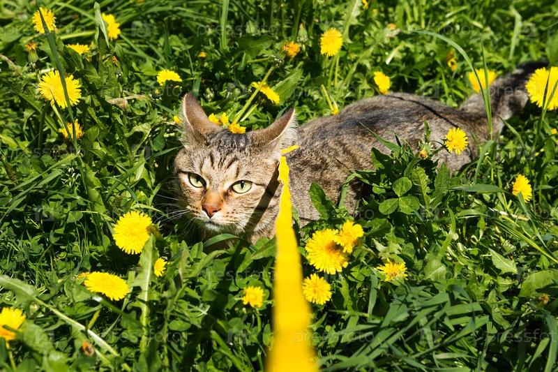 Выгуливание домашней кошки на желтой шлейке. Полосатый кот боится улицы, прячется в траве с одуванчиками
