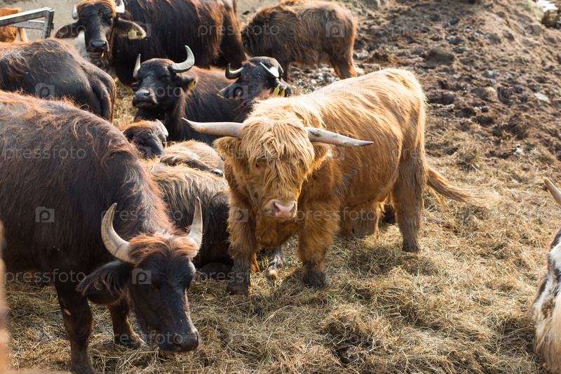 Рыжий шотландский бык на ферме. Стадо крупного рогатого скота, молочные животные в деревне. Густые волосы и длинные коровьи рога