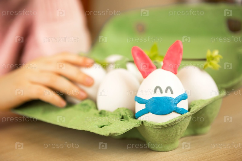 Пасхальное яйцо в виде кролика с пластилиновыми ушками и медицинской маской в лотке для яиц. Детская рука в расфокусе готовится к Пасхе, красит яйца, занимается поделками. Коронавирус Пасха