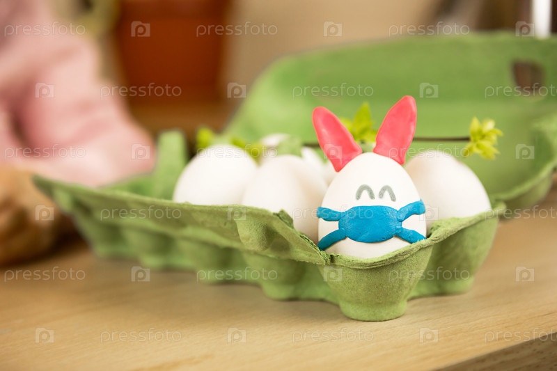 Пасхальное яйцо в виде кролика с пластилиновыми ушками и медицинской маской в лотке для яиц. Детская рука в расфокусе готовится к Пасхе, красит яйца, занимается поделками. Коронавирус Пасха