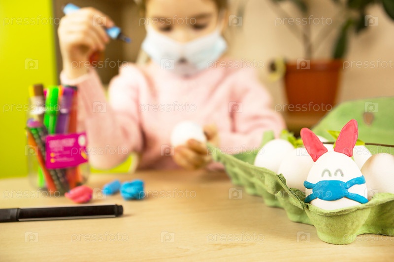 Девочка в ушах зайца лепит из яйца и пластилина пасхального кролика в медицинской маске. Сделай сам, сидим дома, готовимся к религиозному празднику, домашний интерьер