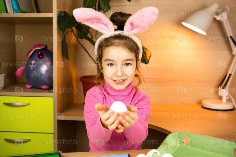 Девушка в ушах пасхального кролика красит яйца фломастером в домашнем интерьере. Поделки, подготовка к религиозному празднику, поднос с яйцами, заячьи ушки из пластилина