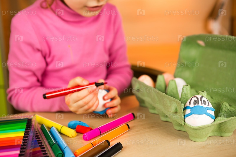 Девушка с кроличьими ушками делает медицинские маски из пластилина для пасхальных яиц. Яйцо с глазами и синяя маска в лотке. Сделай сам, сидим дома, готовимся к религиозному празднику, домашний интерьер