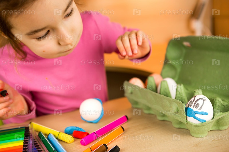 Девушка с кроличьими ушками делает медицинские маски из пластилина для пасхальных яиц. Яйцо с глазами и синяя маска в лотке. Сделай сам, сидим дома, готовимся к религиозному празднику, домашний интерьер