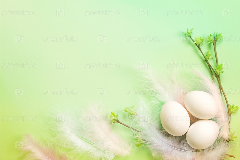 Белые пасхальные яйца в нежном гнездышке из цветных перьев с распустившимися почками на ветвях. Весна, религиозный праздник, зарождение жизни. Бледно-зеленый фон