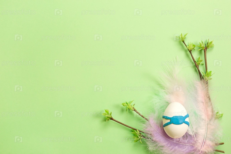 Белые пасхальные яйца в нежном гнездышке из цветных перьев с распустившимися почками на ветвях. Яйцо в синей пластилиновой медицинской маске - эпидемия, защита от вируса