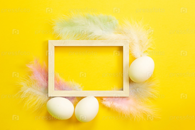 Пасхальная белая рамка на ярко-желтом фоне из куриных яиц и цветных нежных перьев. Весна, религиозный праздник, пасхальное украшение, приветствие, копия пространства, макет