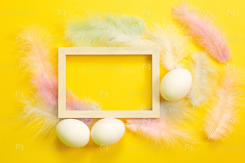 Пасхальная белая рамка на ярко-желтом фоне из куриных яиц и цветных нежных перьев. Весна, религиозный праздник, пасхальное украшение, приветствие, копия пространства, макет