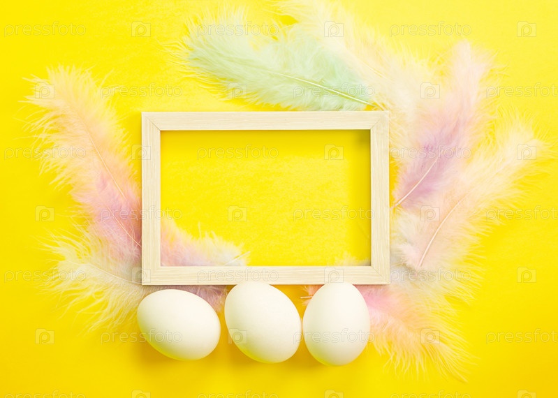 Пасхальная белая рамка на ярко-желтом фоне из куриных яиц и цветных нежных перьев. Весна, религиозный праздник, пасхальное украшение, приветствие, копия пространства, макет