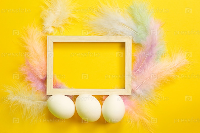 Пасхальная белая рамка на ярко-желтом фоне из куриных яиц и цветных нежных перьев. Весна, религиозный праздник, пасхальное украшение, приветствие, копия пространства, макет