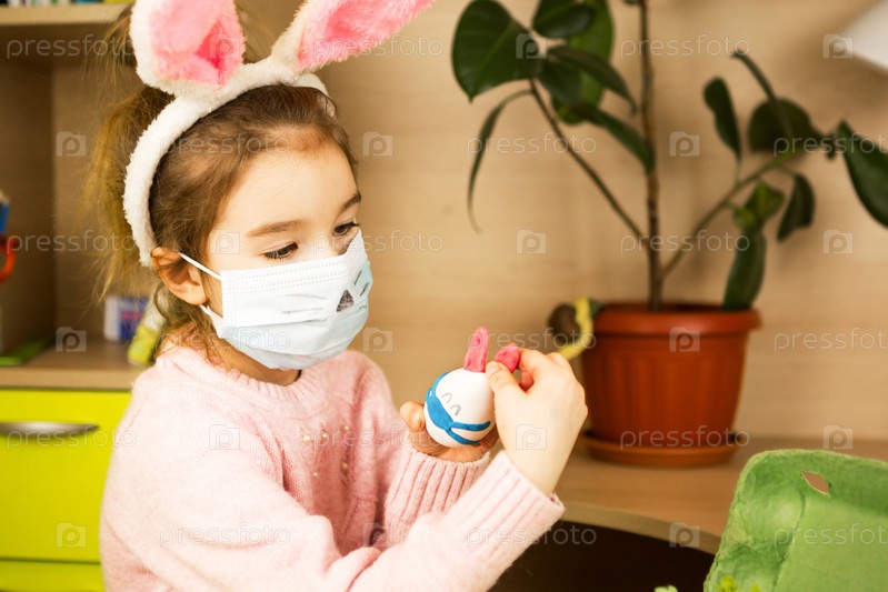 Девочка в ушах зайца лепит из яйца и пластилина пасхального кролика в медицинской маске. Сделай сам, сидим дома, готовимся к религиозному празднику, домашний интерьер