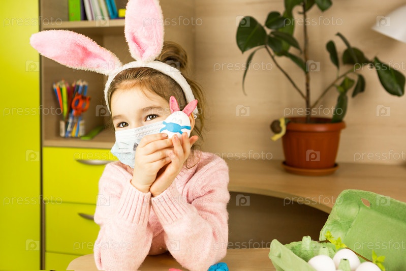 Девочка в ушах зайца лепит из яйца и пластилина пасхального кролика в медицинской маске. Сделай сам, сидим дома, готовимся к религиозному празднику, домашний интерьер