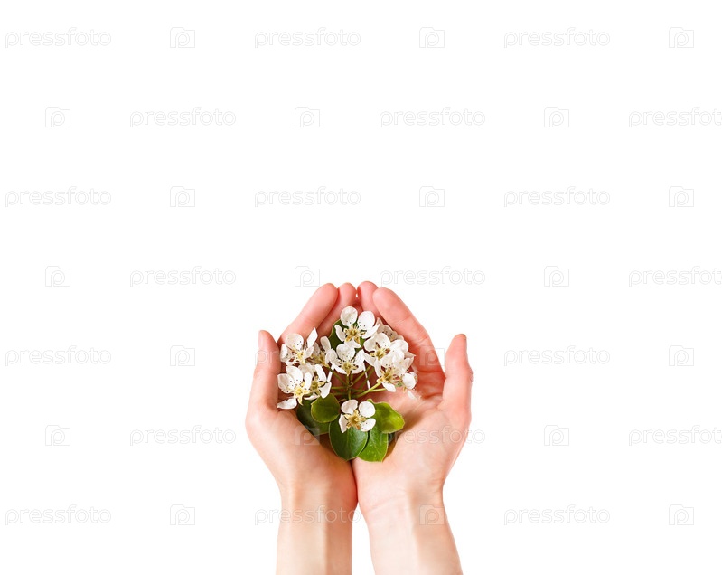 Женские руки с белыми цветами яблони в ладонях на белом фоне изолируют. весенняя пора, любовь, нежность. уход за кожей, натуральная косметика. Баннер, место для текста