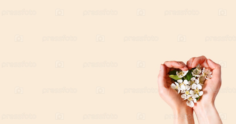 Женские руки с ладонями в форме сердца и белыми цветами яблони на розовом фоне шампанского. весенняя пора, любовь, нежность. уход за кожей, натуральная косметика. Баннер, место для текста