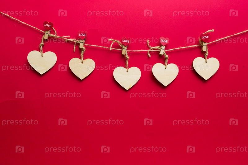 Гирлянда из деревянных сердечек с наклейками и надписью LOVE на красном фоне. День святого Валентина. Праздничные огни, флаеры, влюблённые