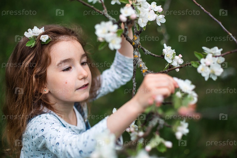 Милая маленькая девочка 5 лет в цветущем саду белой яблони весной. Весна, фруктовый сад, цветение, аллергия, весенний аромат, нежность, забота о природе. Портрет