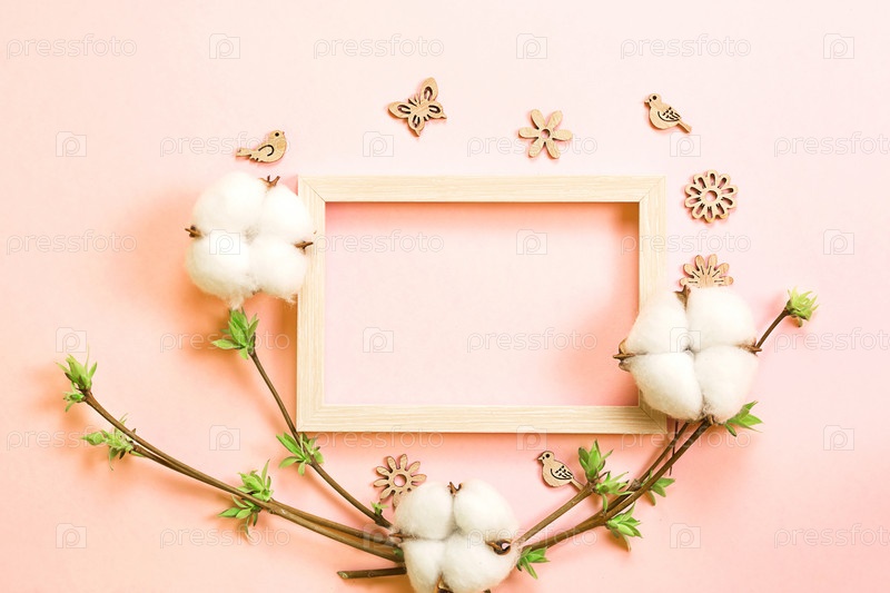 Каркас из цветов хлопка, нежных листочков из распустившихся бутонов на ветках-ростках на розовом фоне и резных деревянных бабочек, птиц, орнаментов. Весна, новая жизнь, нежность