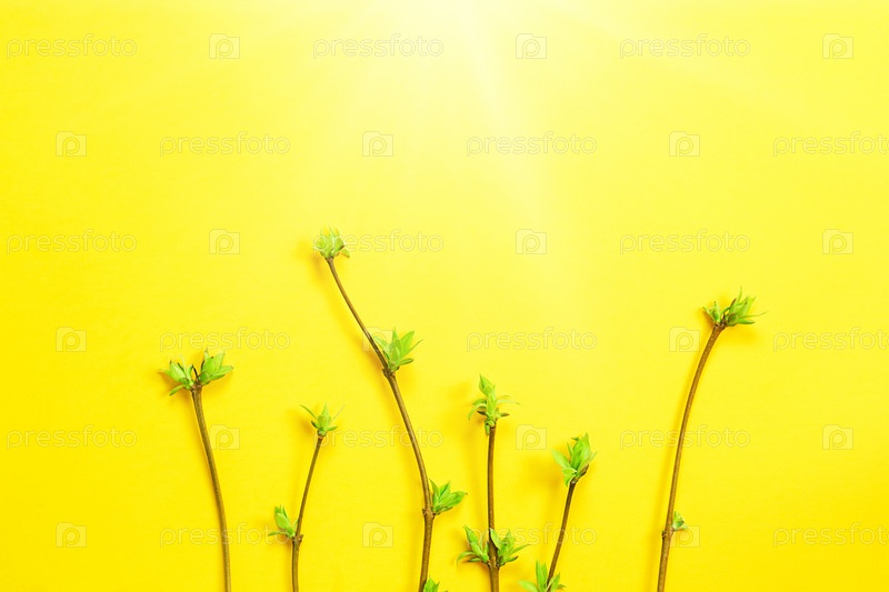 Нежные листочки из распустившихся бутонов на ветвях-ростках на желтом фоне. Весна, начало новой жизни