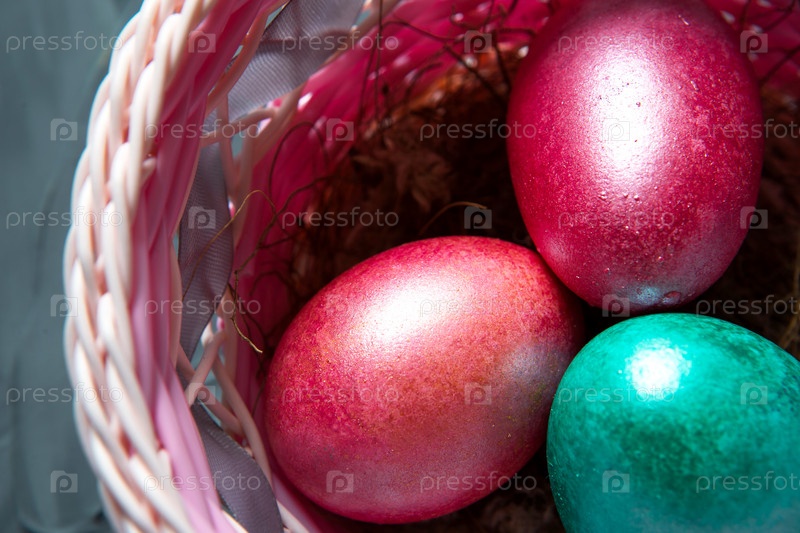Красочные окрашенные мраморные блестящие пасхальные яйца в корзине с нежными перьями крупным планом. Гнездышко с соломой - пасхальное украшение на стол