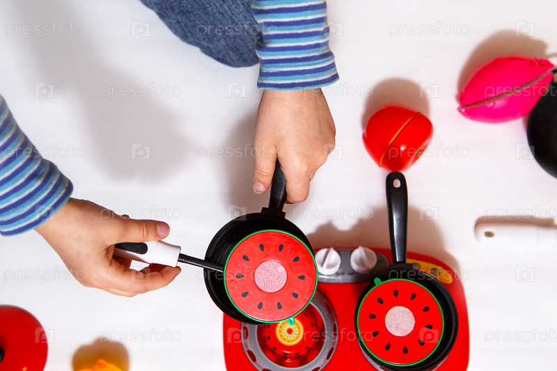 Ребенок играет с нарезанными пластиковыми овощами и фруктами на липучке, готовит еду на игрушечной плите в миске. Детская кулинария, девочка учится готовить. Белый фон, крупный план, концепция