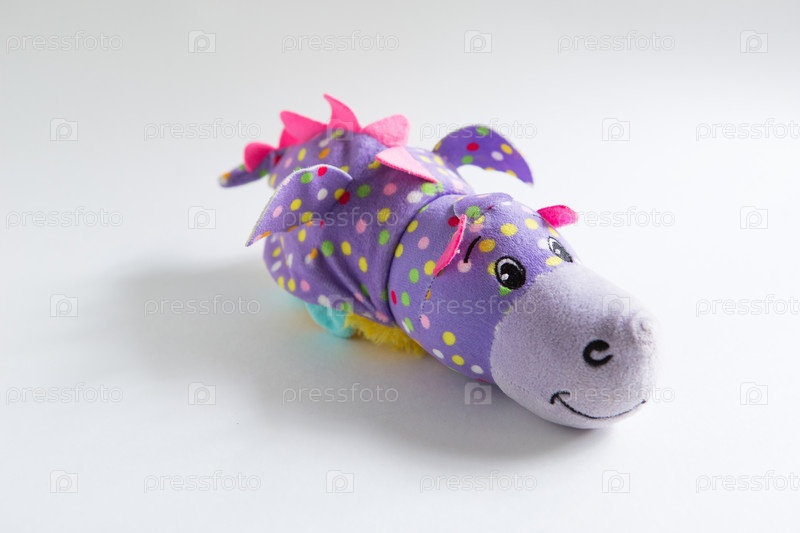 Плюшевая мягкая детская игрушка фиолетовый дракон с разноцветными круглыми пятнами. Выверните его наизнанку. Белый фон, место для текста
