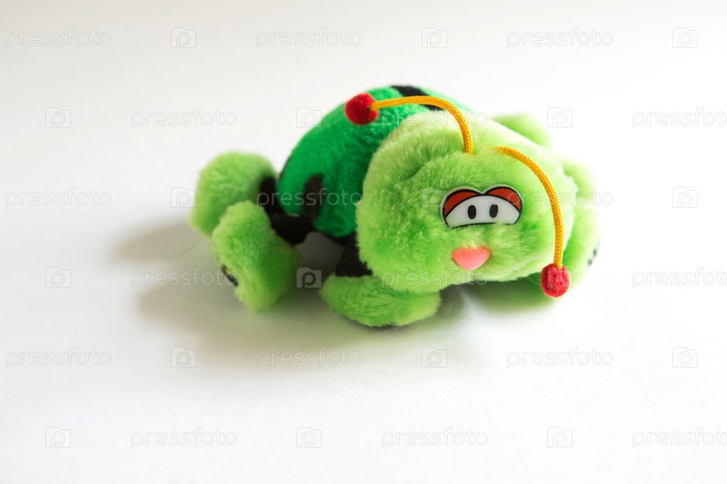 Мягкая плюшевая игрушка для детей - зеленая божья коровка. Жук с грустными глазами, красными колокольчиками на усиках, нереального цвета с черными пятнами и большими лапами. Детская игрушка крупным планом, место для текста