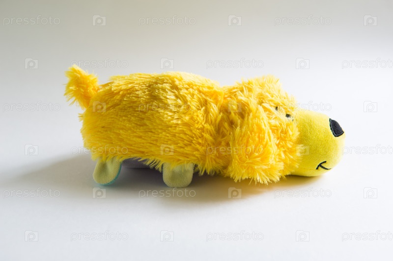 Плюшевая мягкая детская игрушка-собака с длинной желтой шерстью. Игрушка двусторонняя на белом фоне, место для текста