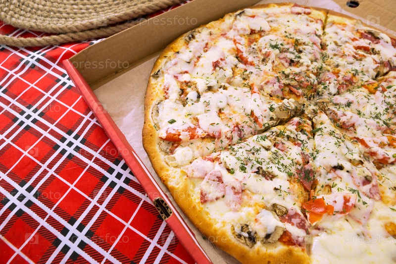 Пицца в картонной коробке на красной клетчатой скатерти. Служба быстрой доставки еды, итальянская кухня. Вечеринка. Копировать пространство