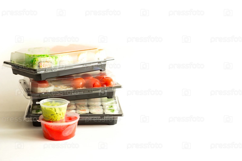 Суши и роллы в транспортировочном контейнере. Доставка блюд японской кухни с маки, васаби и имбирем. Фаст-фуд на заказ. Белый фон