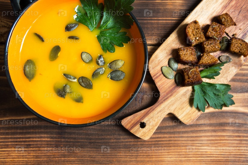 Тыквенный суп в миске с семенами и петрушкой на деревянном фоне. Крекеры со специями на доске