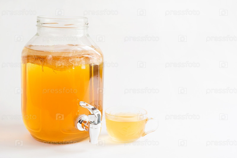 Чайный гриб — напиток из чайного гриба в стеклянной банке с краном. Прозрачная кружка с дрожжевым напитком из японского гриба-медузы. Белый фон, здоровая пища