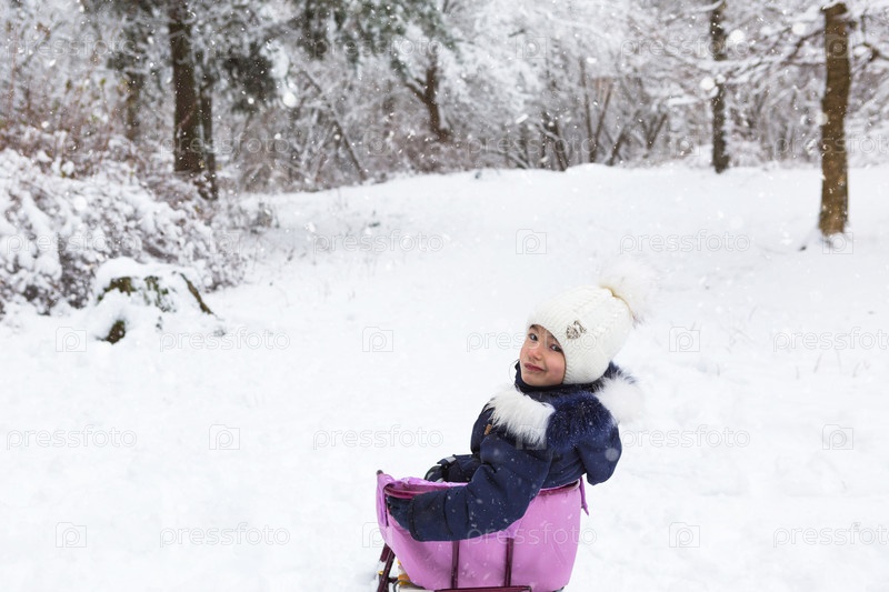 Маленькая девочка в теплой одежде сидит на санях. Зимний лес, прогулка