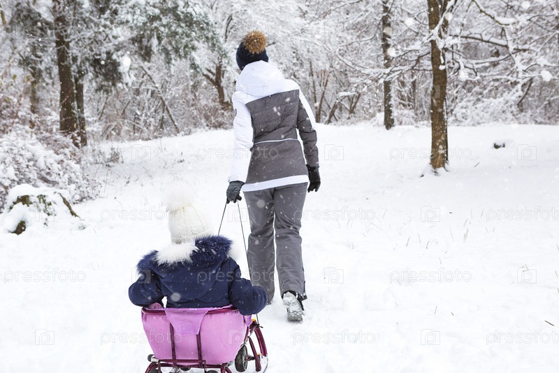 Мама везет свою маленькую дочь на санках в гору по зимнему снежному лесу. Активный семейный отдых на свежем воздухе