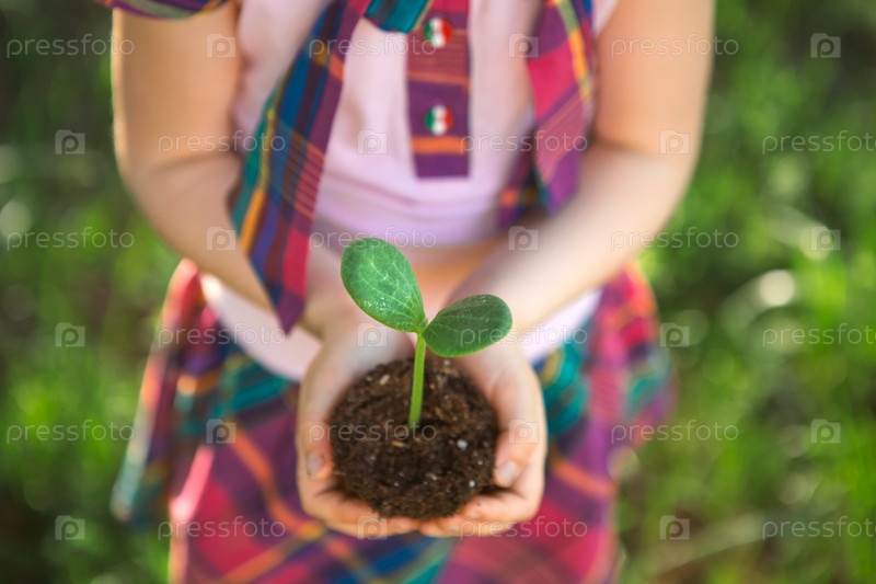Молодой зеленый росток в руках ребенка в свете солнца на фоне зеленой травы. Натуральные саженцы, экологичность, новая жизнь, молодость. Концепция развития, мира, заботы