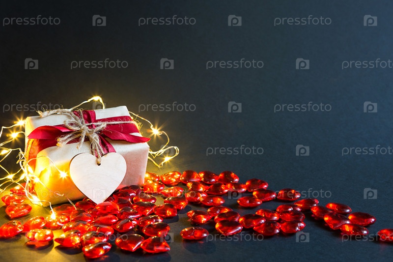 Красные стеклянные сердца с подарком.День святого Валентина. Праздник, баннер. Шоппинг и подарок, подарок любимому человеку, влюбленной паре