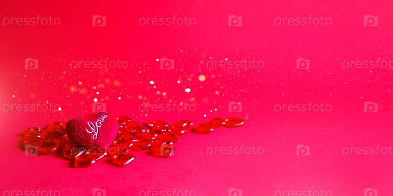 Красные стеклянные сердца и мягкое плюшевое сердце со словами Любовь на розовом фоне - День святого Валентина. Праздник, баннер. Шоппинг и подарок, подарок любимому человеку, влюбленной паре