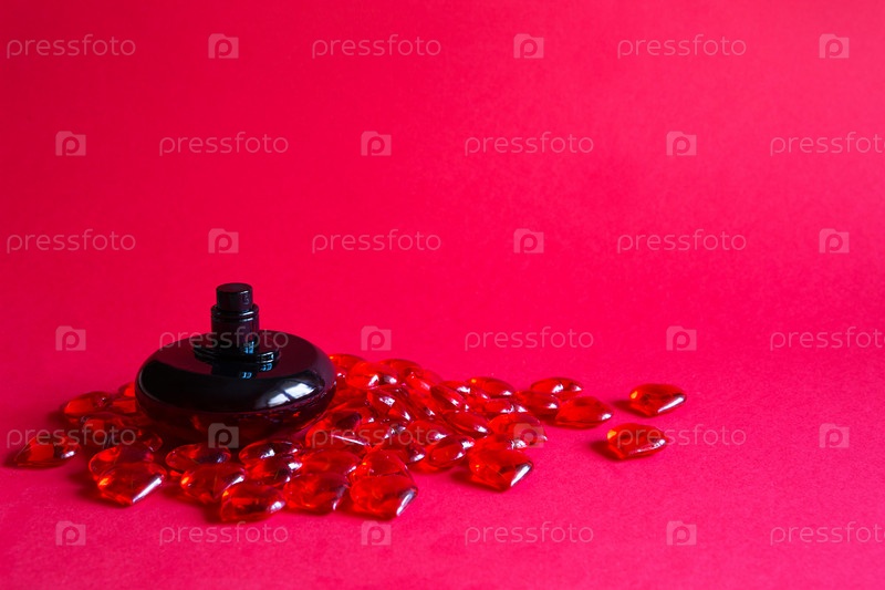 Флакон духов на красном столе среди стеклянных сердец. Подарок на День Святого Валентина любимой, знакомство