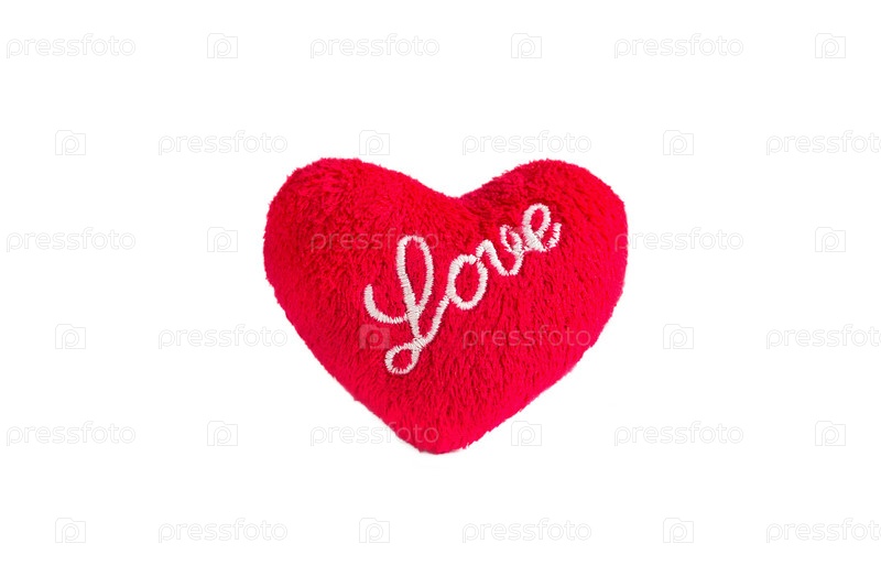 Красное мягкое плюшевое сердце с надписью Love на белом фоне со сенью.День святого Валентина, знакомства, чувства, подарки