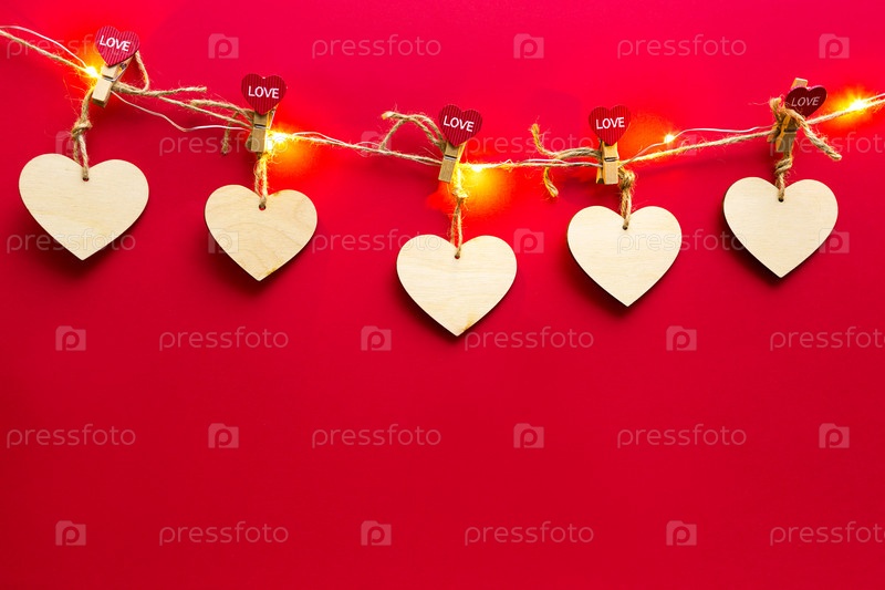 Гирлянда из деревянных сердечек с наклейками с надписью LOVE на красном фоне. День святого Валентина, макет. Праздничные огни, флаер, влюблённые