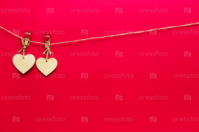 Гирлянда из деревянных сердечек с наклейками с надписью LOVE на красном фоне. День святого Валентина, макет. Праздничные огни, флаер, влюблённые
