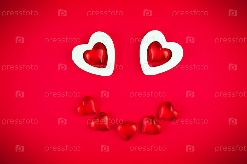 Симпатичное лицо из сердечек на красном фоне-улыбка на день святого Валентина. Забавно выражайте чувства влюбленных. Место для текста
