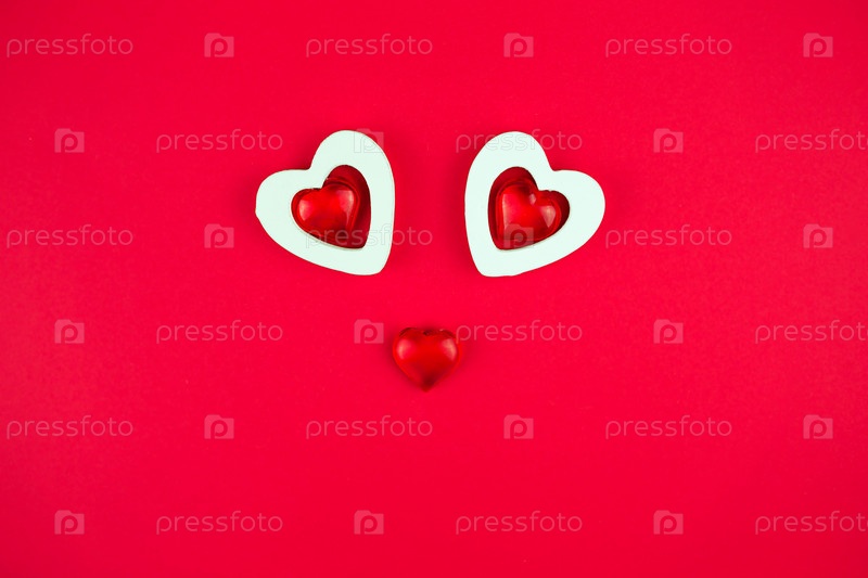 Симпатичное лицо из сердечек на красном фоне-улыбка на день святого Валентина. Забавно выражайте чувства влюбленных. Место для текста