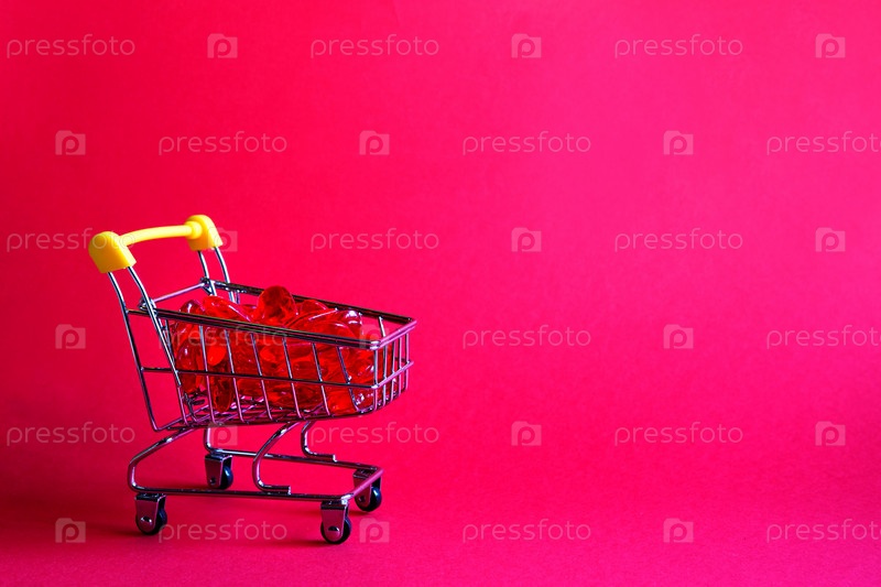 Корзина со стеклянными красными сердцами - покупка подарков для близких, влюбленных пар в день святого Валентина. Акции в праздник влюбленных, товары с любовью. Место для текста, баннер. Красный фон