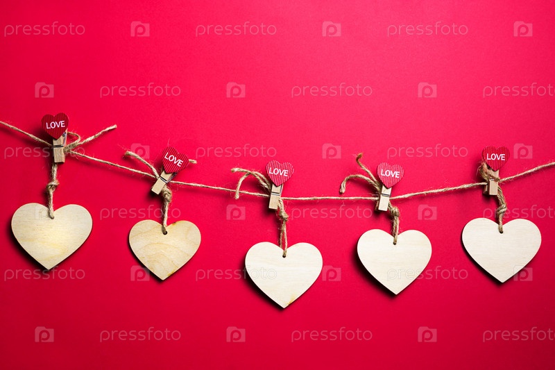 Гирлянда из деревянных сердечек с клеем и надписью LOVE на красном фоне. День святого Валентина